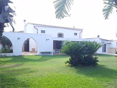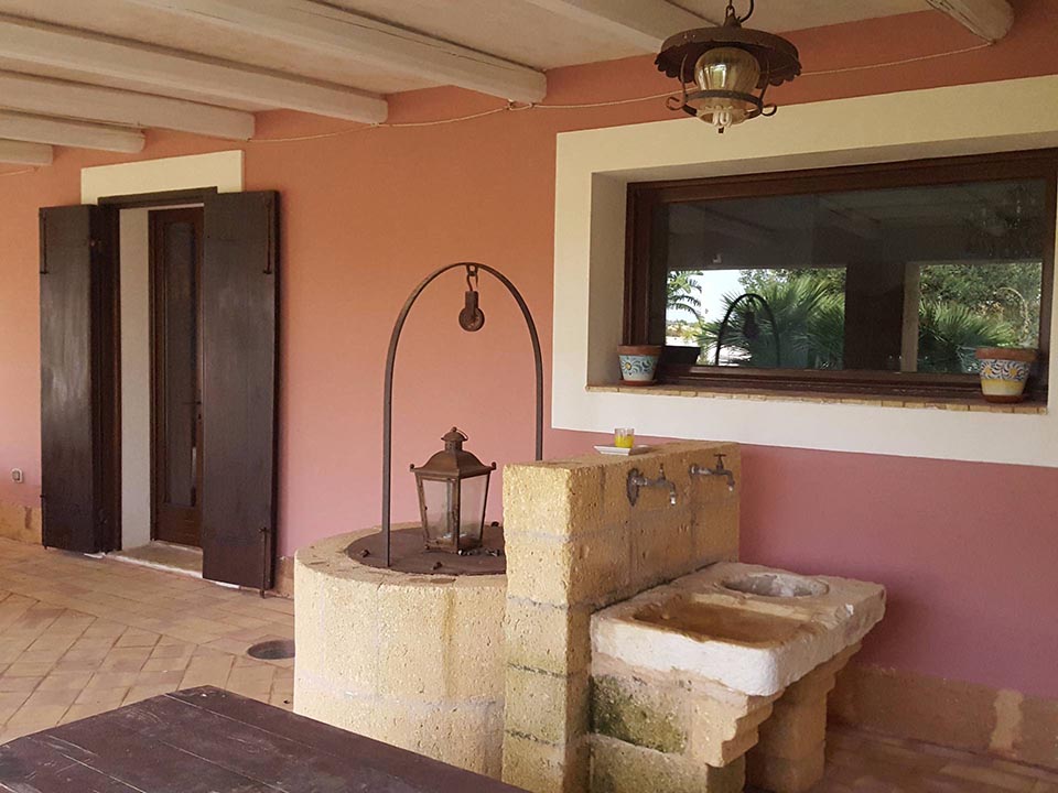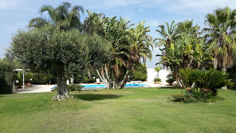 Un’ampio cancello costituisce l’accesso principale della proprietà dal quale si accede prima in una corte interna con archi a volta che la circondano, proseguendo si arriva sul al giardino di 1400mq adornato da piante tipiche della vegetazione mediterranea tra cui un ulivo secolare a primeggiare la vista. Sempre all’esterno un’ ampia veranda coperta con tettoia e travi in legno dal quale si gode la vista del giardino e della piscina di (12mt x 6mt) rappresenta il perfetto luogo per trascorre ore di relax dove fare colazione al mattino oppure per le cene all’aperto durante le calde giornate che rappresentano il clima predominante che sono circa sette mesi l’anno.